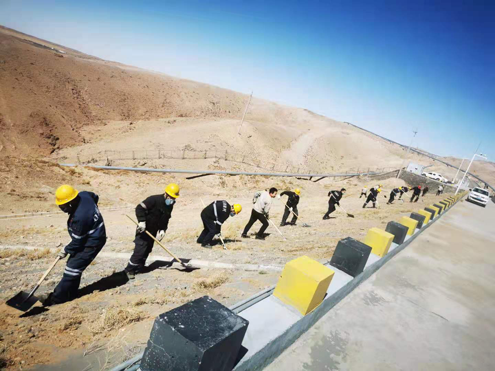 本次活動重點對基礎(chǔ)壩兩側(cè)坡面進行綜合治理,治理長度約1.5公里。面對坡陡、風(fēng)大、黃沙亂舞的工作環(huán)境,黨員干部不懼困難、以身作則、俯沖一線,帶頭撿拾垃圾、清理尾砂、覆土灑水以及對安全警示牌進行維護保養(yǎng)。廣大職工緊跟其后,或一字排開,或矩陣展開,忙碌的身影遍布整個坡面,鏟車的轟鳴聲、鐵锨的吱吱聲與狂風(fēng)的呼嘯聲琴簫合奏,在藍天、斜陽和荒山的襯托下,勾勒出一幅“聲與色”、“動與靜”相得益彰的勞動生產(chǎn)畫卷。